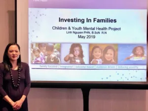 This blog post highlights an interdivisional resiliency project presented by Public Health Nurse Linh Nguyen (Toronto Public Health, pictured above) at the 2019 Community Health Nurses of Canada (CHNC) Conference in Saint John, New Brunswick. Contributors to this post also include Patricia Stevens, health promotion specialist, and Nicolette Slovitt, child health and development manager at Toronto Public Health.
