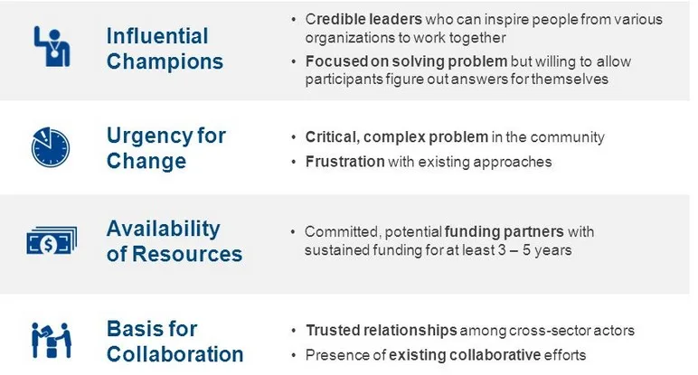 Collective impact researchers and practitioners have identified several preconditions necessary to implement a collective impact approach: