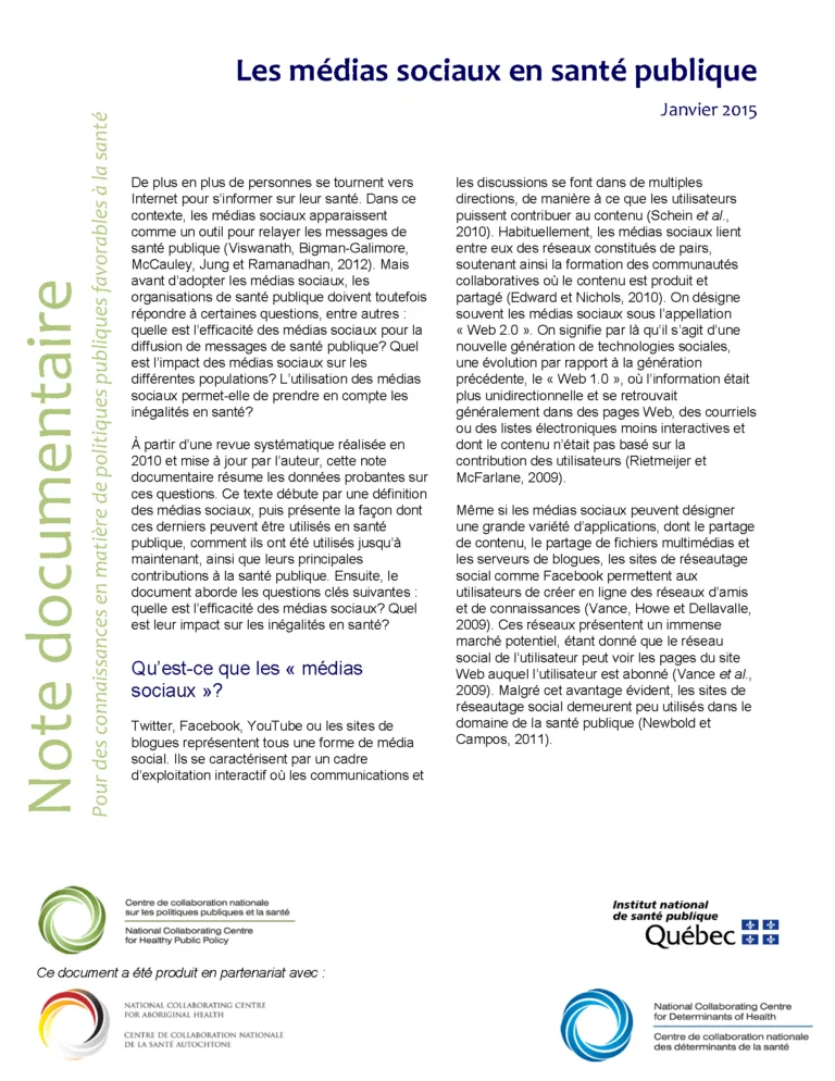 Cette « note documentaire » traite des données probantes mitigées quant à l’efficacité de recourir aux médias sociaux pour modifier les comportements de santé de la population. L’efficacité dont il est question ici concerne les pratiques exemplaires en matière de diffusion des messages quant à savoir si les médias sociaux constituent une façon plus équitable pour communiquer avec tous les groupes de population.