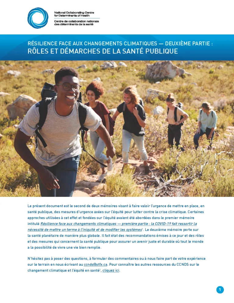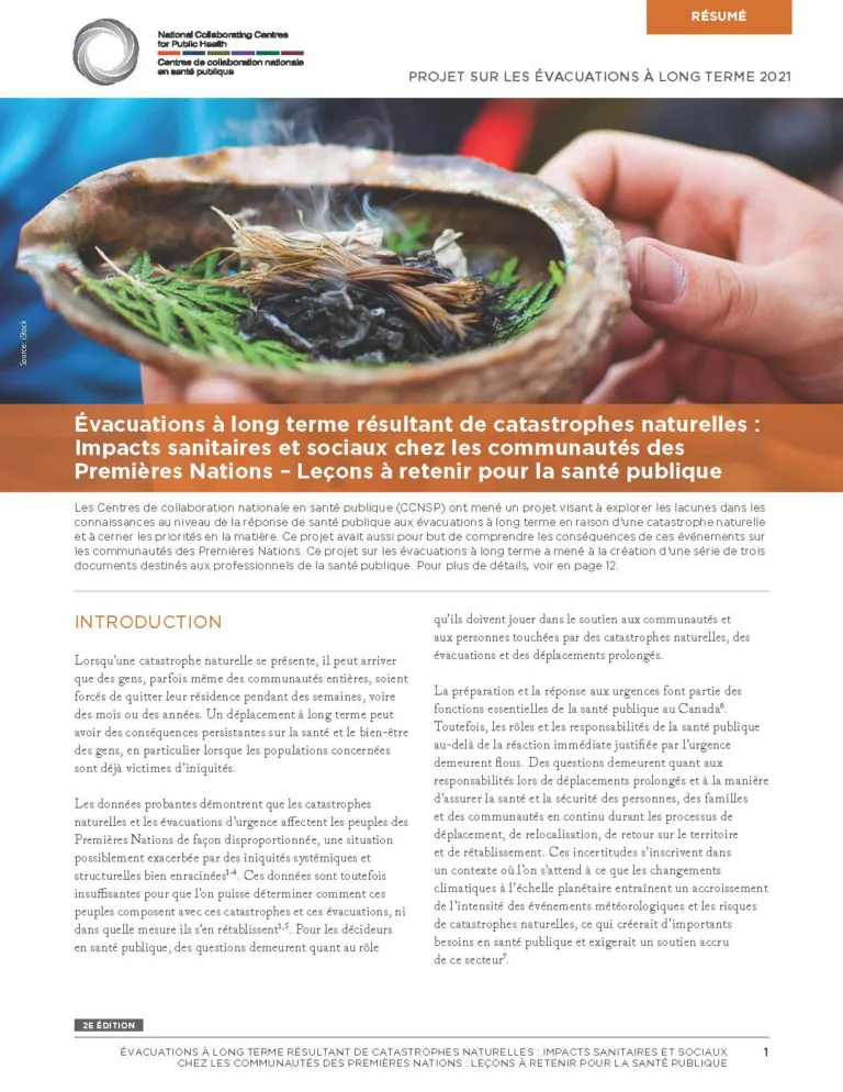 Le sommaire produit par les Centres de collaboration nationale en santé publique (CCNSP) concerne le projet sur les personnes évacuées à long terme. Il fait état de constatations tirées d’une recherche participative et de l’incidence de ces constatations sur les mesures prises par la santé publique concernant les déplacements prolongés lors de catastrophes naturelles.