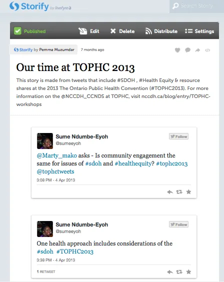 Tools such as Storify and Tweetchat (the website) can be used to aggregate comments and posts organized through a hashtag. Specific media objects (e.g. pictures, websites, other social media posts) can be included and curated – selected, edited, and/or placed in a specific sequence – to create ‘storylines’ that show the flow of conversation. These are really collections of artifacts gathered from the conversation stream that can be used to preserve learning, generate further conversation, and assist in the identifying next steps and follow up actions.
