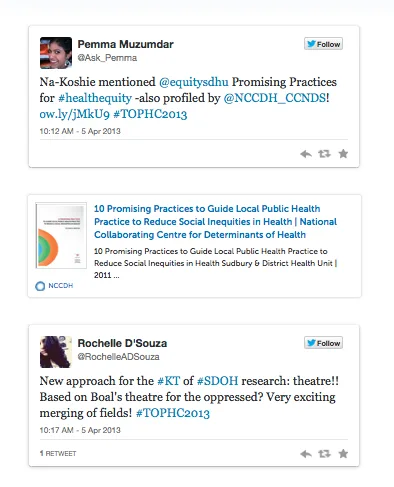 By placing organizations, networks and individuals on equal ground, social media can create opportunities to engage multiple sectors on issues related to the social determinants of health and health equity, and can offer a complementary online environment within which public health professionals can share thoughts, resources, and follow opportunities for further exchange.
