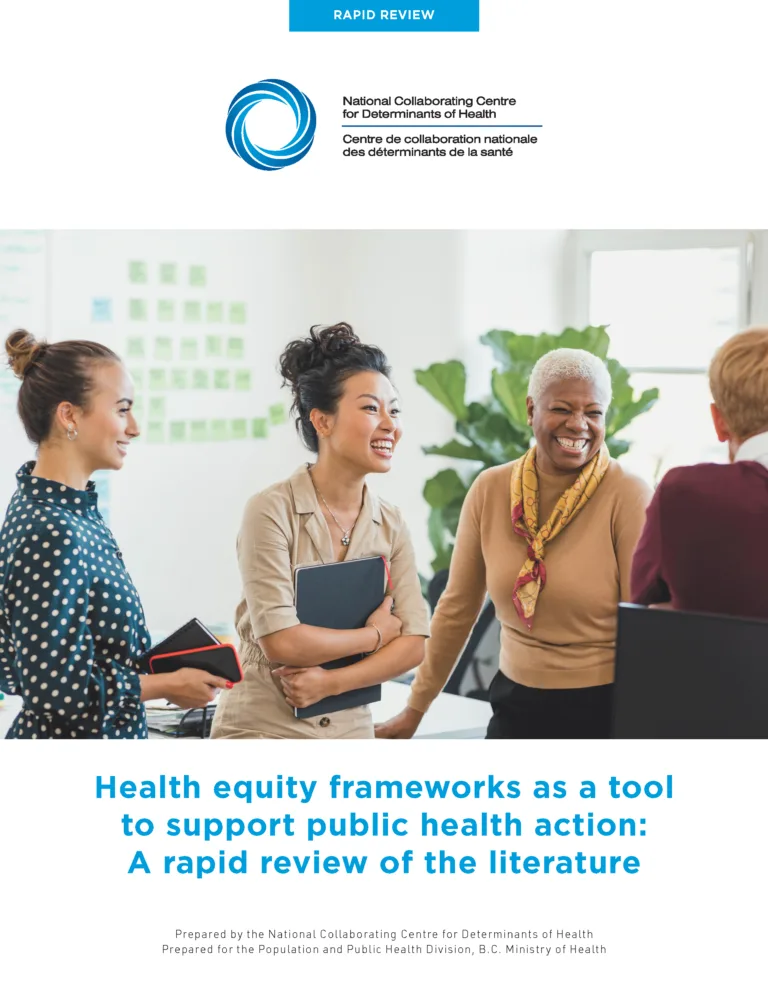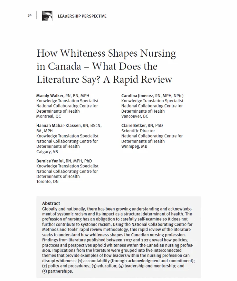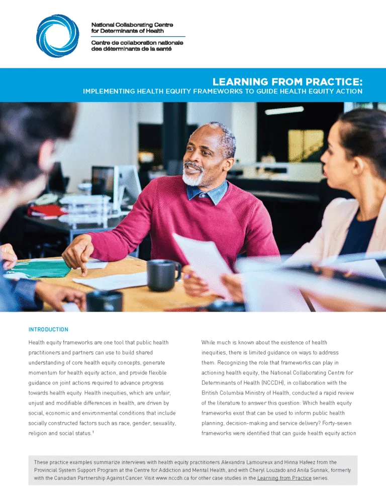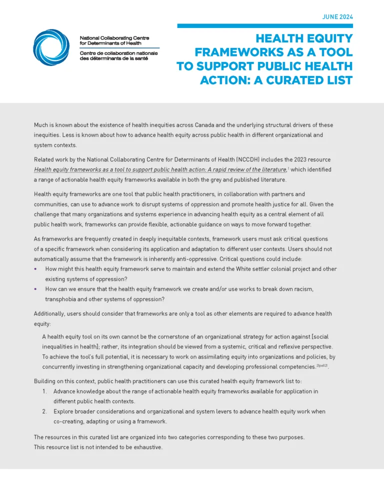 This resource explores the role of the social determinants of health public health nurse in Ontario since 2015. The findings of this study describe a compelling opportunity for public health units across Canada to enable public health nurses to meaningfully address the structural and social determinants of health and advance health equity.