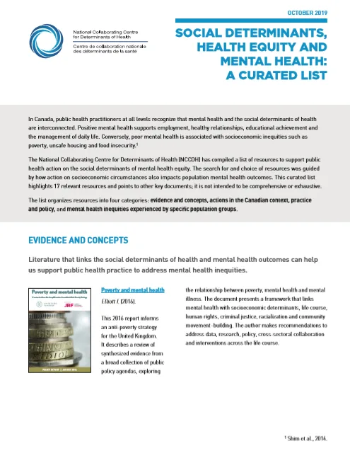 This curated list from the National Collaborating Centre for Determinants of Health (NCCDH) highlights resources that support public health action on the social determinants of mental health equity.
