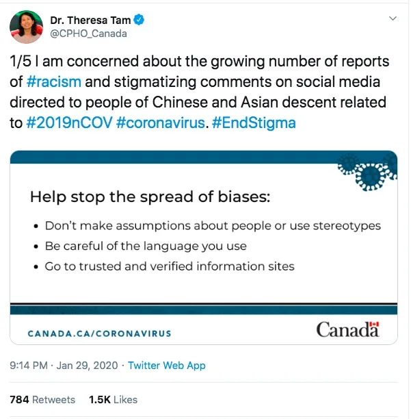Image: A January 2020 Twitter thread from Chief Public Health Officer Theresa Tam. In it, Dr. Tam condemns the influx of anti-Chinese and anti-Asian sentiment stemming from COVID-19 [24]